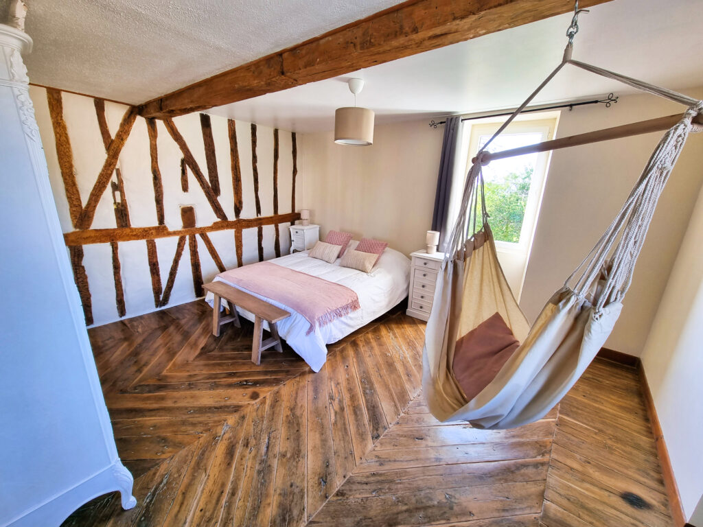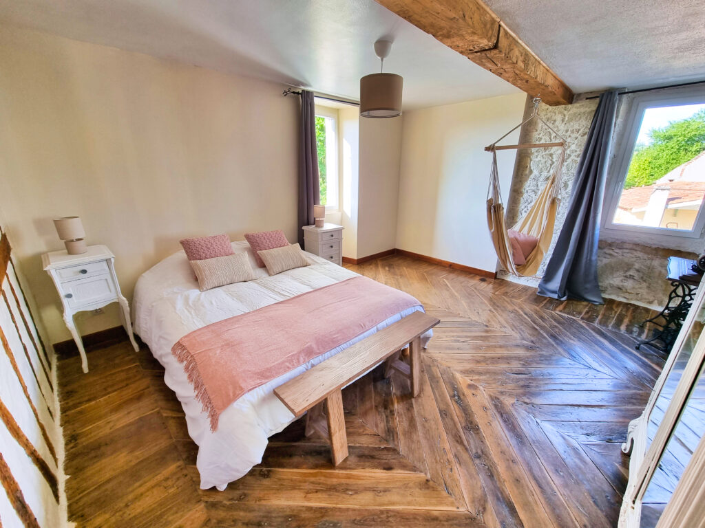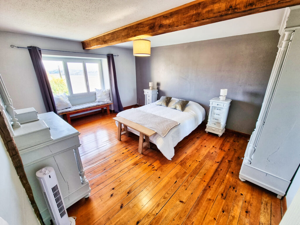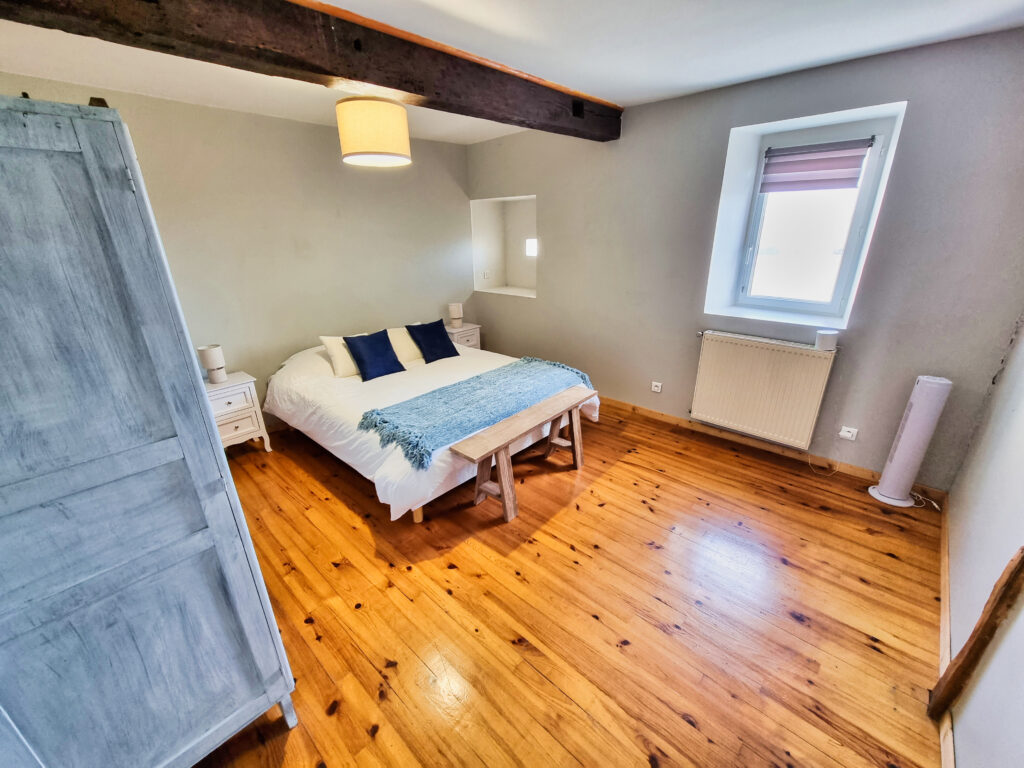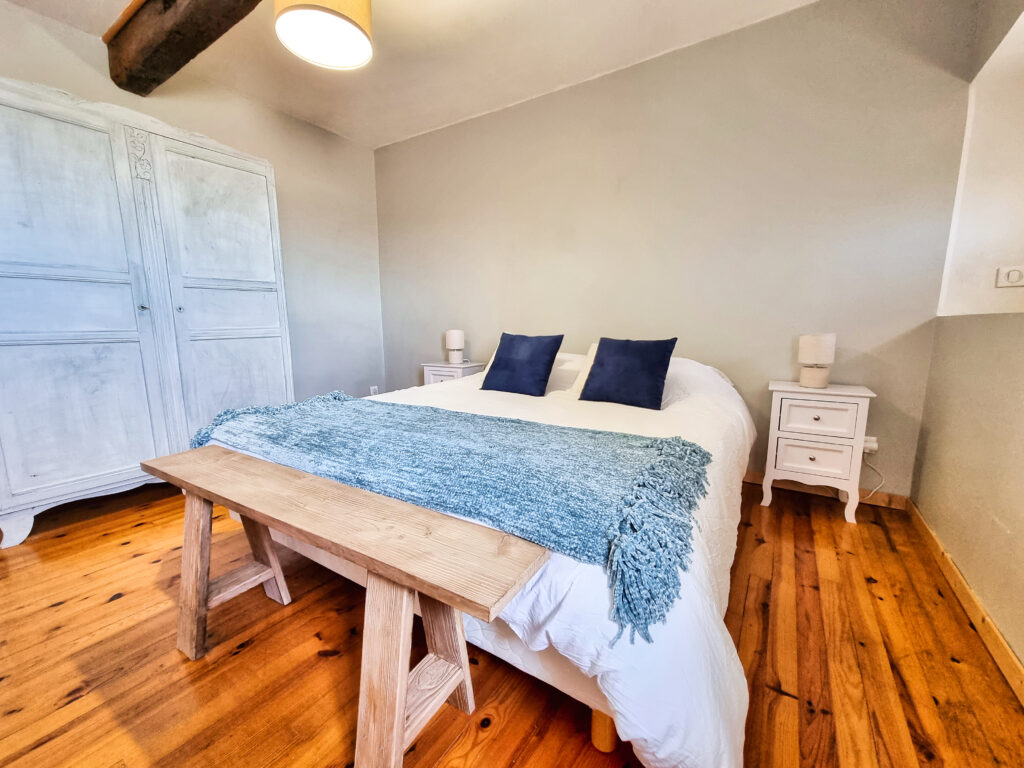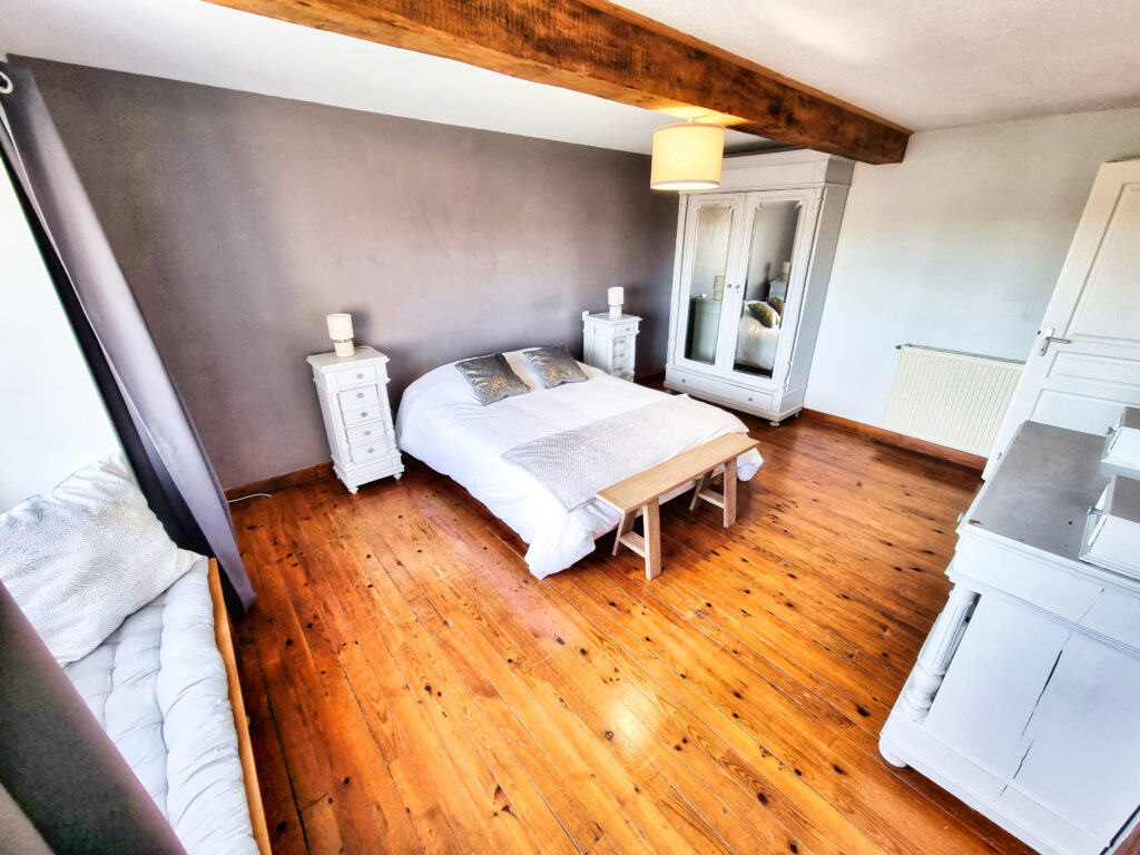 Au deuxième étage, une chambre de 18 m2, équipée d’un lit de 160×200, tables de chevet et armoire.