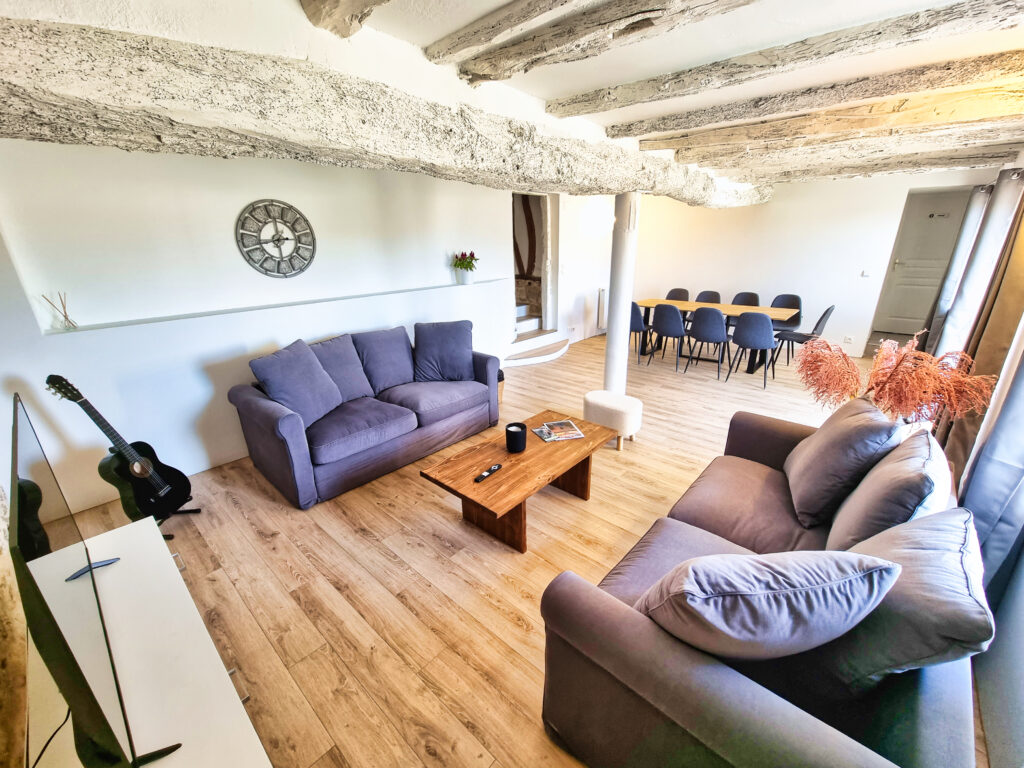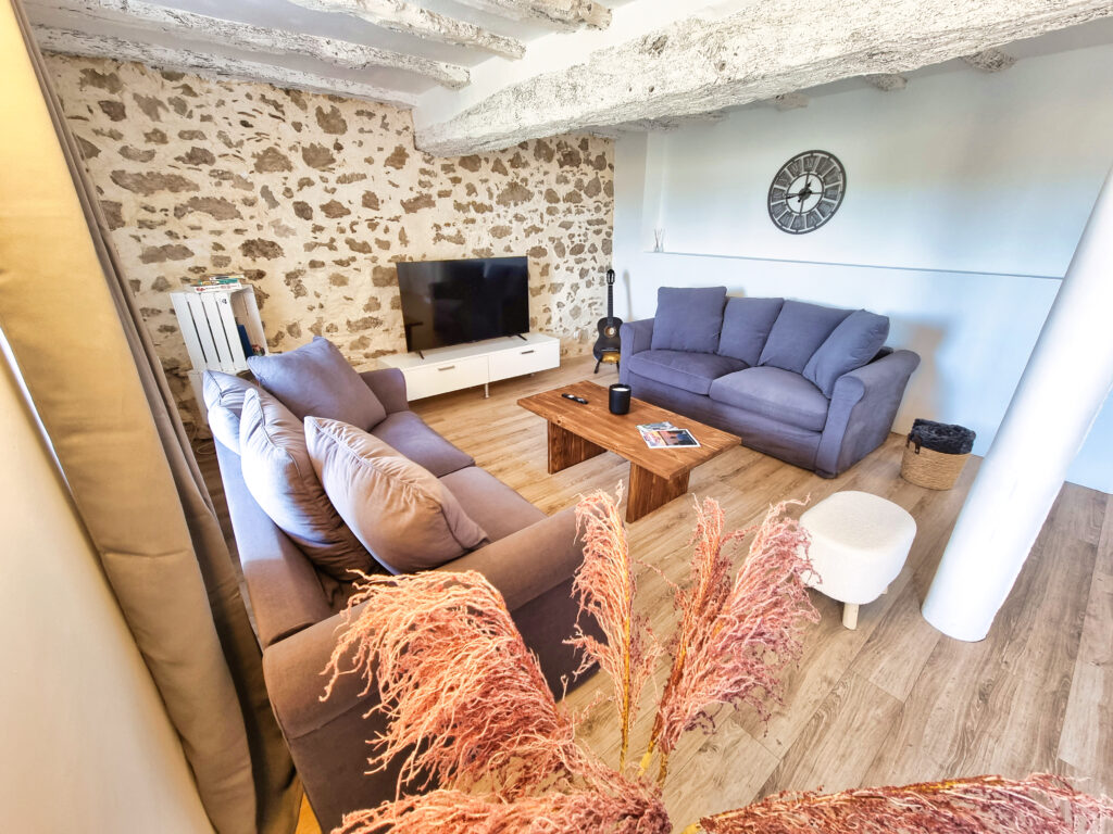 un salon avec 4 couchages supplémentaires, avec 2 canapés-lits de 140×190. Une télévision TCL de 55′.
